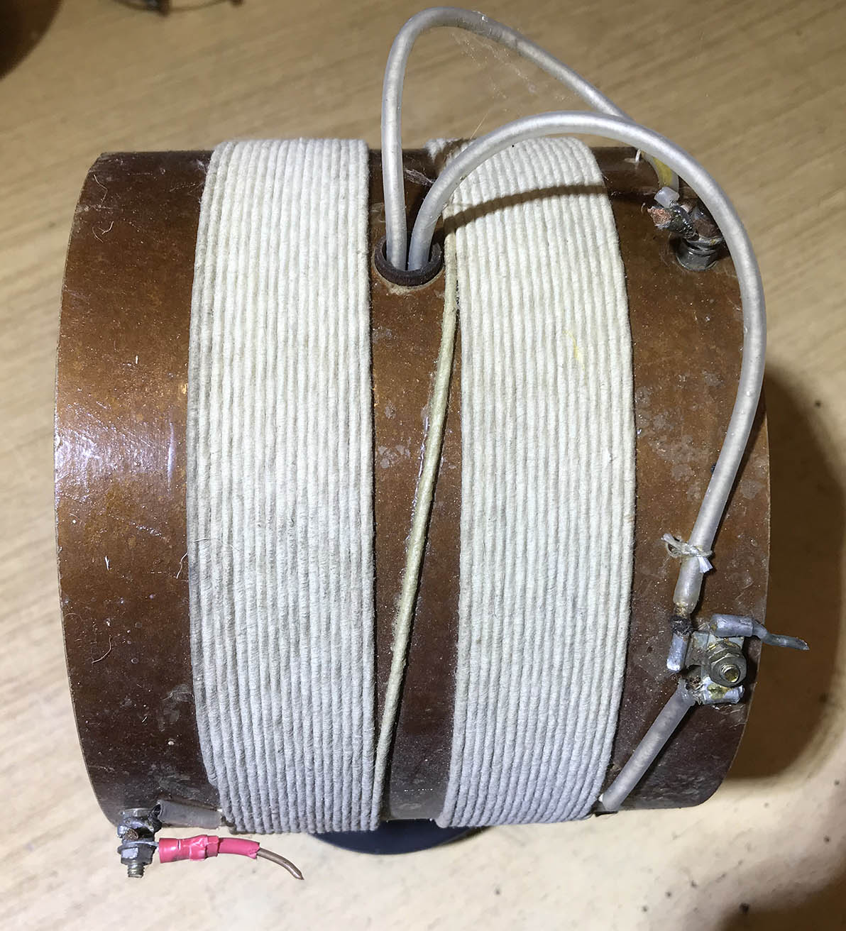 There are 11 taps on the coil and it would appear that the unit can be switched between various configurations. There’s no manufacturer’s name on the unit but I don’t think it’s home made. The steel case was rusty so I’ve rubbed it down with wet and dry and I’m in the process of spraying it black.