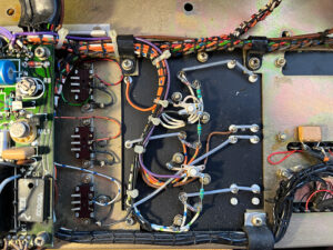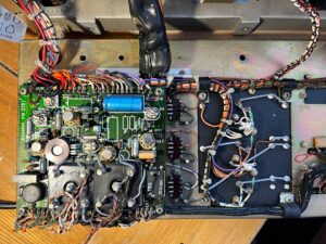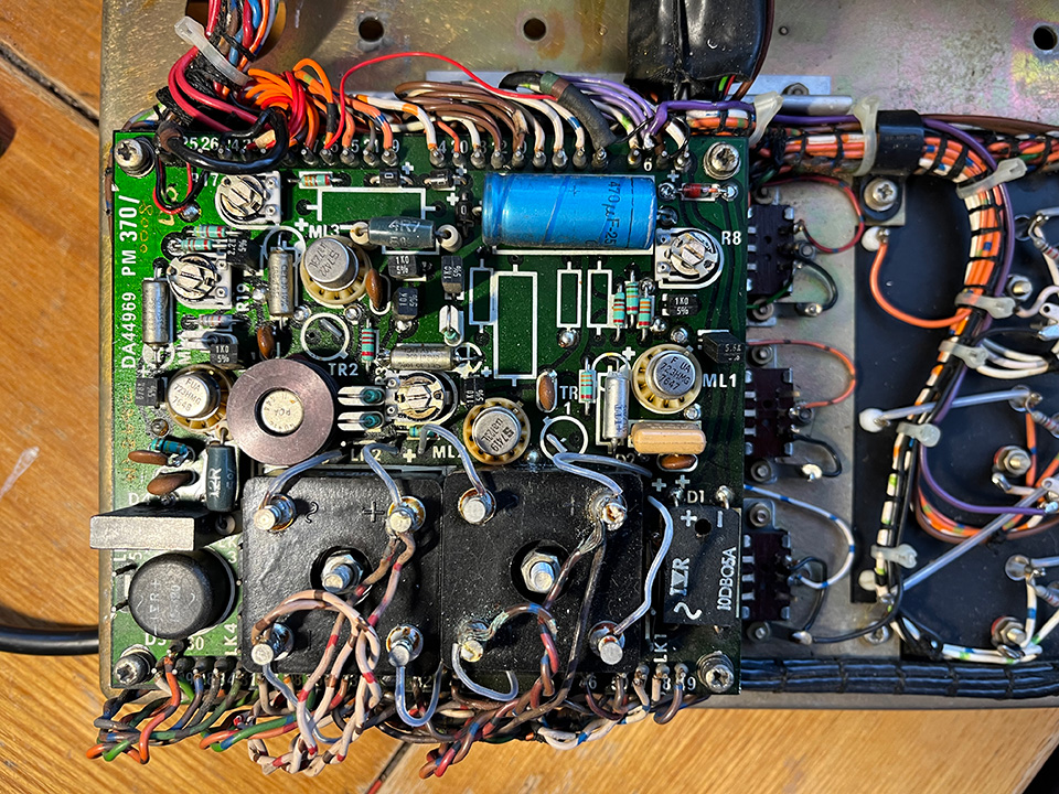 There were several power supply problems. The 20 volt rail dropped to about half voltage at times. I discovered that there were several intermittent connections the power supply board. They were mainly caused by heat from one of the bridge rectifiers. There was an intermittent hum or, what’s better described as, a gurgling sound on SSB signals. I cleaned the pre-set pots on the main PSU board, left-hand photo, and the three slide switches just to the right of the board. Also shown at the bottom of the main board are the two bridge rectifiers. One was running very hot, so I bolted a new replacement to the chassis. The work completed, all traces of hum disappeared and the 20 volt rail was stable.